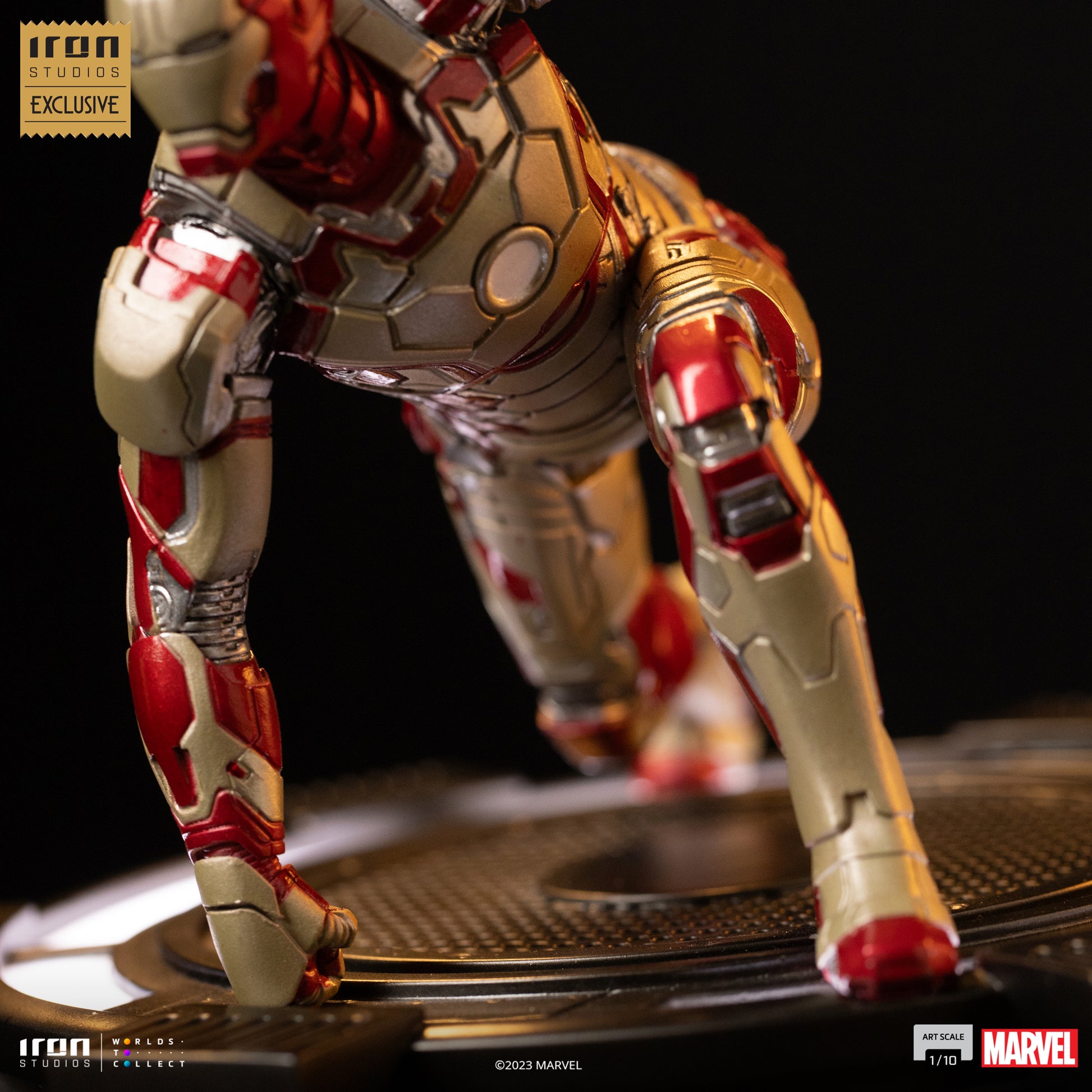 Over a platform from Stark Industries, the Golden Avenger does right by his name when he presents himself with a new suit built as his new main armor after the Battle of New York. Designed for automatic deployment and assembly, the suit is made of many separated parts that can collapse, but by using an independent propulsion system, each part can fly to the user and get automatically assembled. A series of chips implanted in his arms, allowing him to summon his armor and to put it on someone else with a simple hand gesture. Punching the floor with his famous hero landing pose, Iron Studios bring once again in a new scale the statue “Iron Man Mark XLII Deluxe - Event Exclusive - Marvel - Art Scale 1/10”, one of Iron Studios’ exclusive releases on CCXP 2023, that portray some of the most praised and awarded Iron Studios Legacy Replica 1/4, Battle Diorama 1/6, and Prime Scale 1/3 statues in the Art Scale 1/10 format.